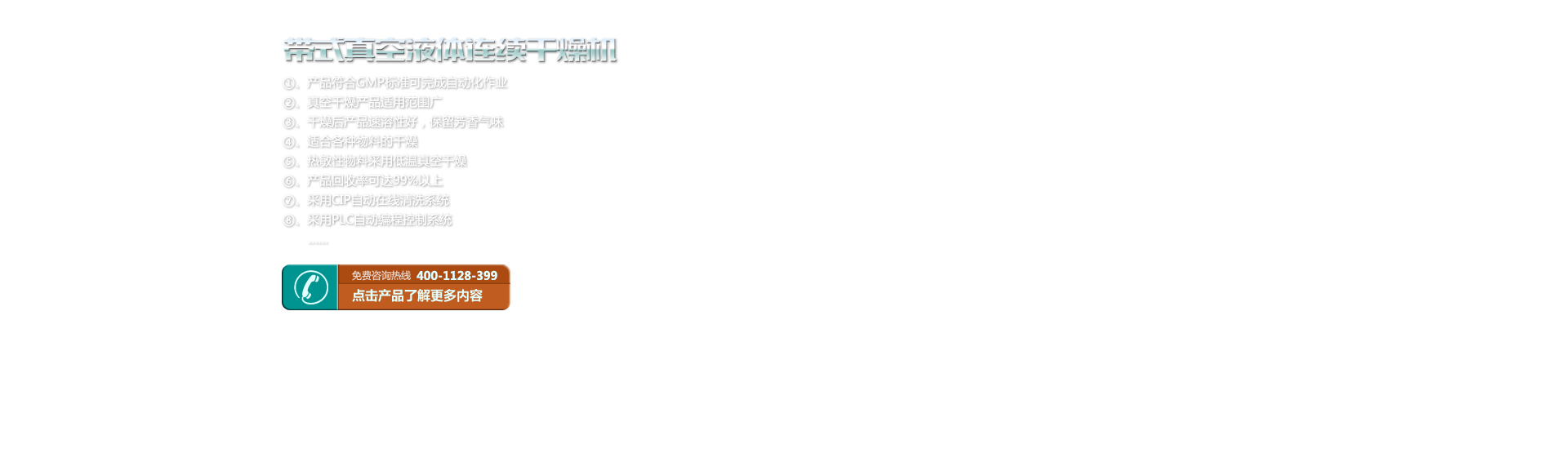 該機為提醇的高濃度、高粘度的中藥浸膏解決了一大難題,以往采用離心噴霧,因為溫度,熱敏性成份遭破壞、易粘壁;采用真空烘箱因時間長、能耗高、易染菌、易返潮,無法連續生產,均達不到GMP質量標準。 本機克服上述存在的許多問題,即干燥溫度低,有效成分不流失,干燥時間短、能耗低、無污染,能連續生產。
